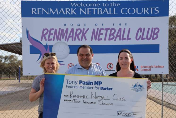 Barker MP Tony Pasin with Rachael Stoeckel, and Rachel Brauer, of the Renmark Netball Club. PHOTOS: supplied